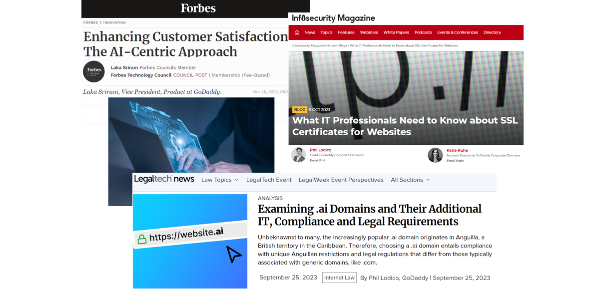 - Phil Lodico, Head of GoDaddy Corporate Domains, discussed Examining .ai Domains and Their Additional IT, Compliance and Legal Requirements with Legaltech News. In this article, Lodico talks about the growing importance of .ai domains amid the rise of artificial intelligence, emphasizing their role in protecting brands from cybersquatting and safeguarding online brand integrity.