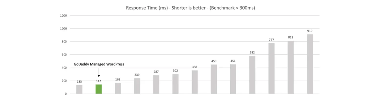 GoDaddy's Managed WordPress hosting has become an industry leader in performance and uptime due to the integration of the global Cloudflare content delivery network (CDN), AI-based features and a WordPress-optimized hosting stack. This great achievement was proven through the independent benchmarks run by Catchpoint throughout 2023, outperforming major competitors in Q3 2023.